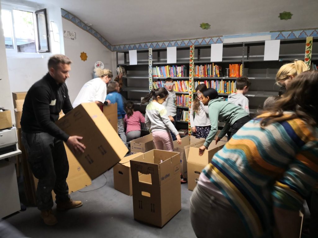 Mit Hilfe des großartigen Teams der BNP Parisbas Real Estate, der Bücherei-Leitung, der SEB-Leitung, dem Förderverein, nicht zuletzt den Freiwilligen aus der Elternschaft und natürlich den Schülern der Klasse 3b haben wir einiges entrümpelt, die Bücherei leer geräumt, gestrichen und einen neuen Teppich verlegt.