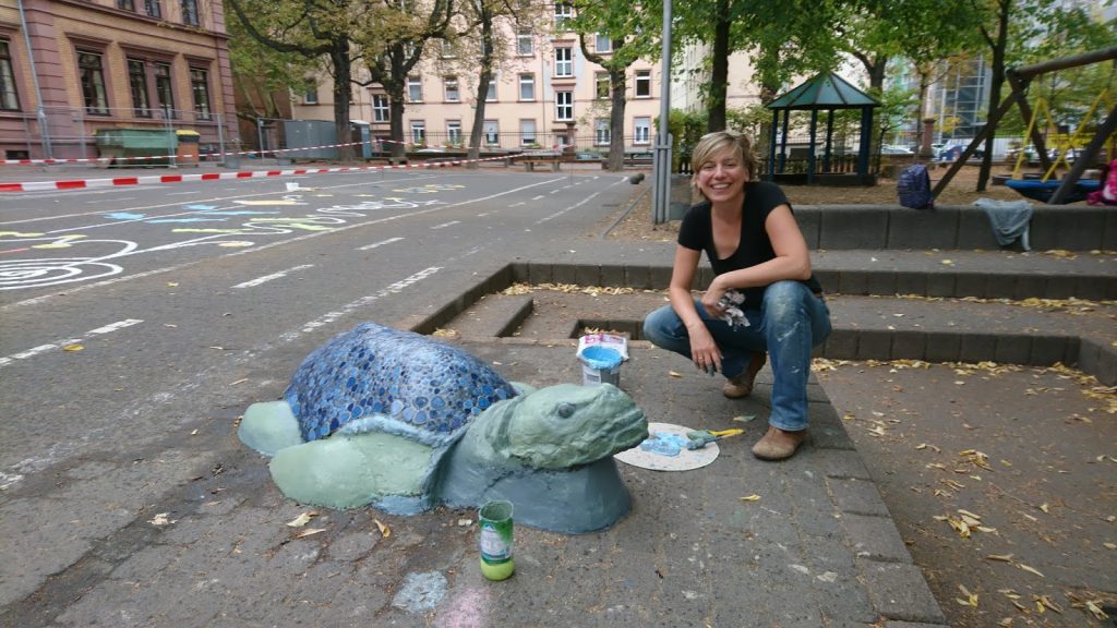 Wir haben den Schulgarten und Pflanzkästen, die durch die Baumaßnahmen stark mitgenommen waren, wieder neu bepflanzt, die Spielgeräte und Infotafeln gereinigt und den Schulhof mit Hüpfekästchen und Pflastermalereien neu gestaltet. Ein besonderes Highlight war die Gestaltung unserer Stein- Schildkröte, die im Mittelpunkt des Schulhofes ein beliebter Treffpunkt ist.