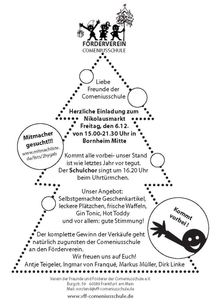 Hiermit möchten wir Euch herzlich zum Nikolausmarkt am Freitag, den 6.12. von 15.00-21.30 Uhr in Bornheim Mitte einladen.